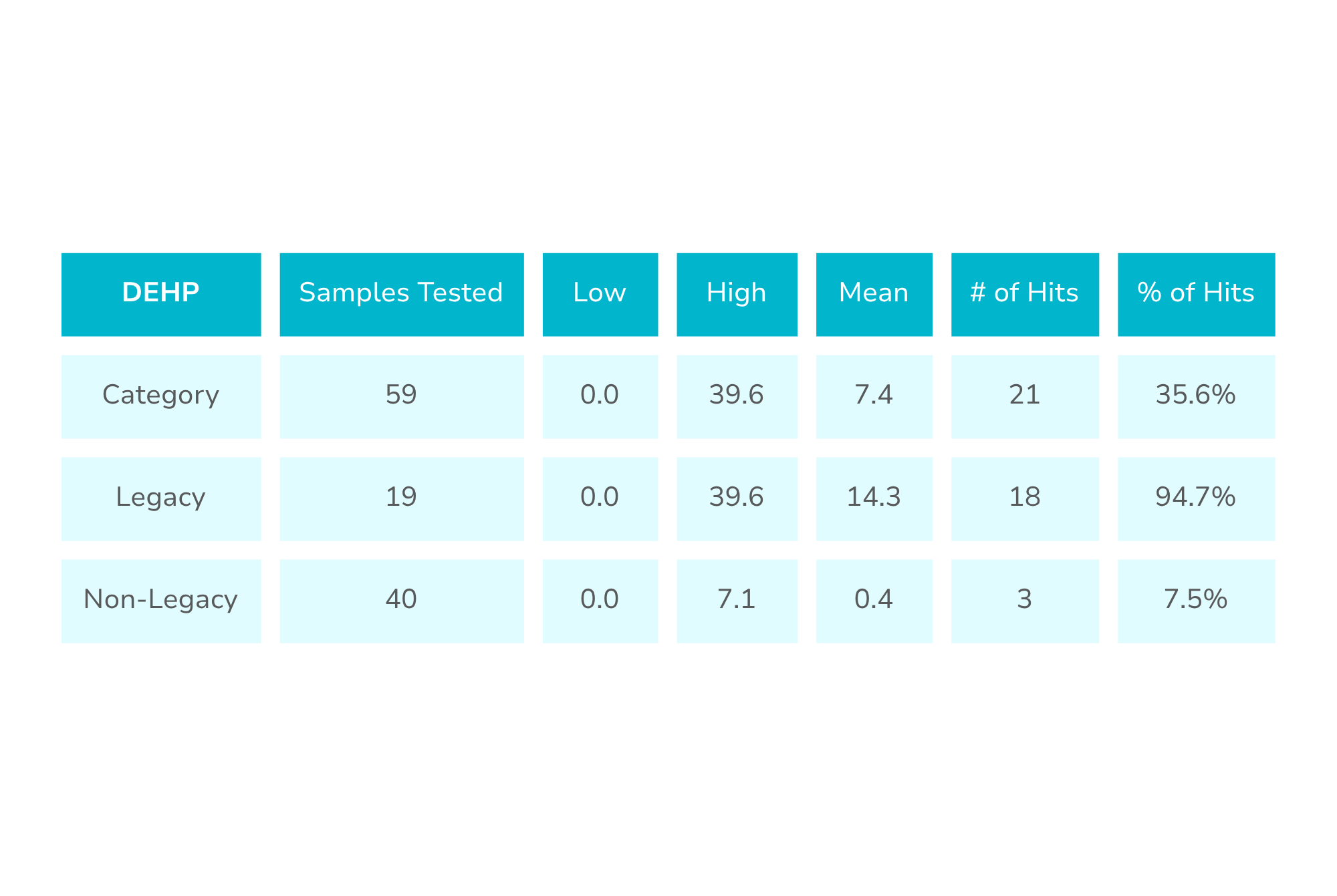 DEHP is a plasticizer used to make plastics more flexible. It can enter food products through processing equipment and packaging materials, or through other environmental contamination. DEHP is not chemically bound to plastics, so it can easily leach into food, especially fatty or oily foods, and its migration is often increased by heat. DEHP is part of the FDA’s GRAS (Generally Recognized As Safe) list. Our research has found DEHP in many different categories we’ve tested, such as protein powder, cereal, and snack bars.